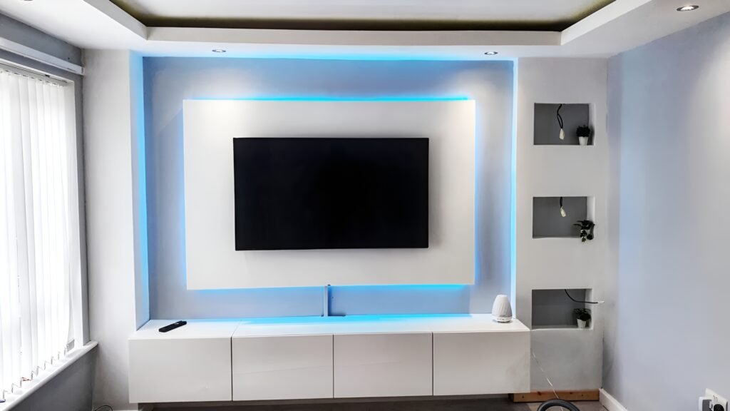 تصميم جبس بورد تلفزيون في الرياض بأحدث الموديلات العصرية، تنفيذ احترافي بخامات عالية الجودة مع إضاءة مخفية ورفوف ديكورية تناسب جميع المساحات، بأسعار مناسبة وخدمة سريعة داخل الرياض.